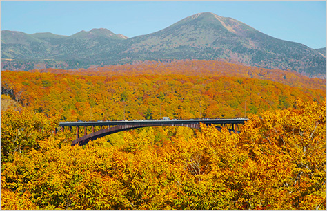 御在所沼から八幡平山頂(標高1,613m)近くを経て秋田県に通じる八幡平アスピーテラインでは、秋にはアオモリトドマツの樹海の中に、黄色い葉をつけたダケカンバの白い樹幹が幻想的に浮き上がる美しい景色をご覧いただけます。また、近くにはブナ、ナラ、カエデ、モミジなどの落葉樹の原生林が生い茂っており、秋は紅葉が非常に美しい松川渓谷もあります。特に森の大橋からの絶景はカメラに収めたくなる絶景。(松川渓谷の紅葉の見頃は例年10月中旬~10月下旬)