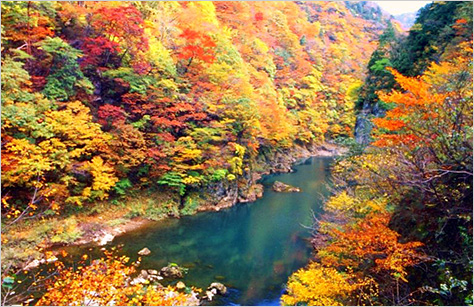 大小の滝や深い谷、荒々しい渓流によって削られた岩肌と、サクラやブナ・カエデを主とする赤や黄色の広葉樹が、時には青く、時には「エメラルドグリーン」に色を変える玉川独特の清流に映え、大自然の見事な調和が織り成す景観となっています。