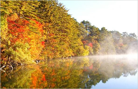 紅葉と神秘の湖沼群とのコントラストが美しい