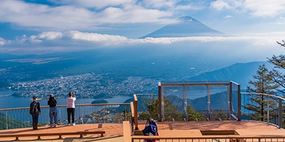 富士山が一望できる人気の絶景スポットである、新道峠に2021年夏に登場した展望デッキです。河口湖や山中湖と富士山の絶景を楽しめるファーストテラスと、目の前に富士山が広がる絶景のセカンドテラスがあり、四季折々の景色が楽しめます。