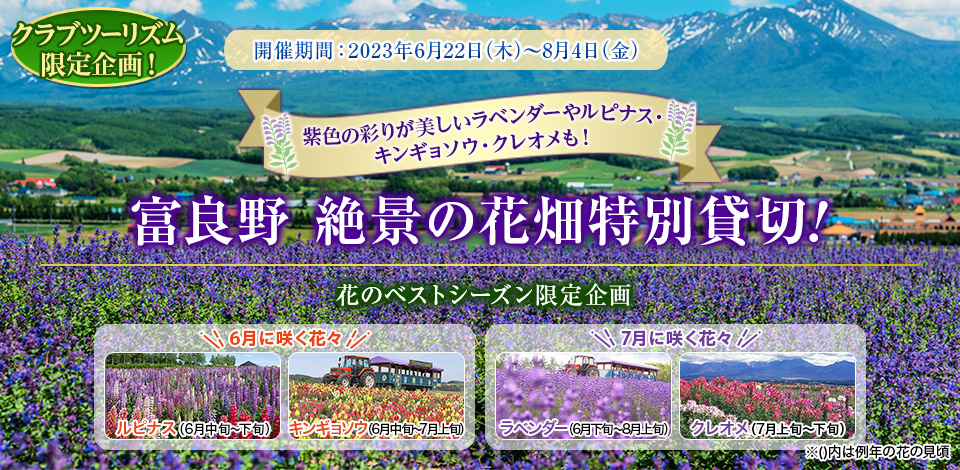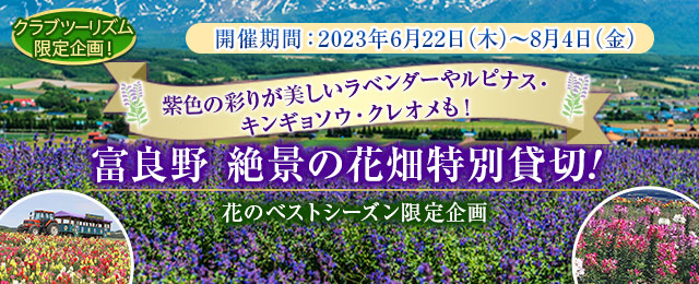 クラブツーリズムの富良野絶景の花畑貸切ツアー!「北海道の夏」として象徴的な富良野の花畑を貸切で見学!花のベストシーズン期限定のツアーをご紹介。添乗員付きでしっかりサポート!ツアーの検索・ご予約も簡単。
