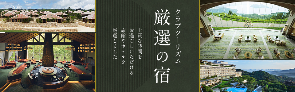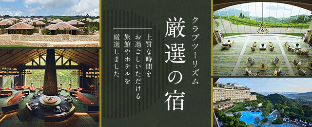 厳選の宿ツアー・旅行ならクラブツーリズム!「5つ星の宿」や弊社Sランクの宿、お部屋食プランの宿、露天風呂付客室の宿、客室20室以下・小規模厳選の宿などをご用意。日頃の疲れをゆっくり癒せる、そんなツアーはいかがですか。ご予約も簡単です。