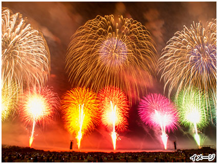 最上川河川敷の広大さを活かしたダイナミックな花火とグランドフィナーレは必見です。見ごたえのあるクオリティの高い花火をお楽しみください。