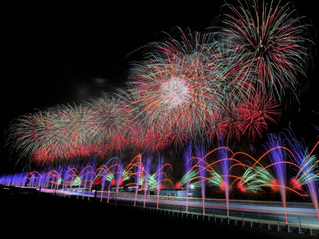 花火と客席の距離も近く、視界いっぱいに広がる花火に包まれるような臨場感を、花火音やその香りとともにお楽しみいただけます。また、目の前でスーパーカーの走行を観覧できるほか、車と並走して打ち上がる花火など、花火とモータースポーツが融合したイベントならではのエキサイティングな演出もご堪能いただけます。