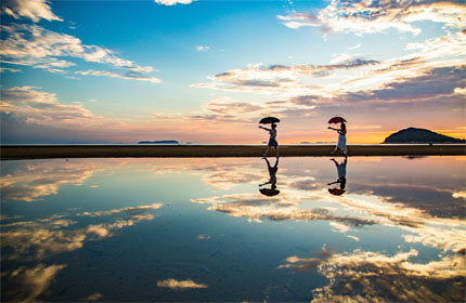 干潮時間帯に無風状態になり水面が波立たなければ、水面が鏡のように空を映す絶景が広がります。さらに日の入りの時刻と重なると一層美しい光景が広がり「日本夕陽百選」にも選ばれています。