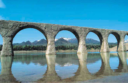 中でもタウシュベツ川に架かる『タウシュベツ川橋梁(通称めがね橋)』は糠平湖の水かさが増える6月頃から湖面に沈み始め、10月頃には湖底に沈みます。水かさが減る1月頃から凍結した湖面に再び姿を現すため、“幻の橋”といわれています。
