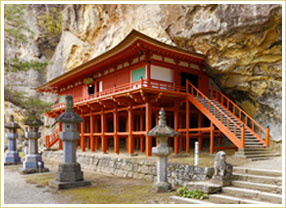 坂上田村麻呂が征夷の記念に毘沙門天を祀った岩窟。懸崖造りの毘沙門堂は、火災のたびに建て直されてきました。平安時代造像の丈六不動明王像(県指定文化財)や北限といわれる「岩面大佛」(磨崖仏)も必見です。境内全域が史跡指定。