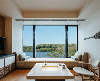 2022年1月14日に北海道・白老温泉にて開業する界 ポロトは、界ブランドにおける北海道初の施設です。湖を敷地内に大胆に引き込んだつくりが特徴的で、全ての客室が湖に面し、その広がりを眼前に感じることができます。まるでポロト湖の懐にひたるような一体感を感じながら、世界的にも珍しいモール温泉の湯浴みが楽しめる宿です。館内のデザインには、アイヌ文化を尊重し、精神性や伝統を取り入れています。