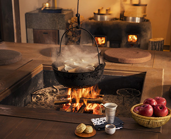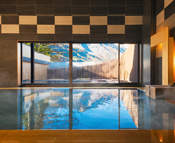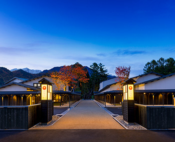 北アルプスに抱かれた長野県大町温泉郷にある「界 アルプス」。雪国のアーケード「雁木(がんぎ)」の通りに沿って両側に客室や温泉棟が立ち並ぶ敷地内では、小川が流れる中庭や、季節によっておやきや燗酒などをご提供する囲炉裏など、自然と人が集うどこか懐かしい田舎の風景を体感できます。