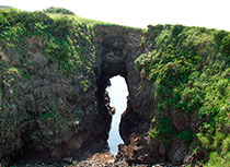 牧崎公園にある、玄武岩の海蝕崖に開いた周囲110mの大穴。名前の由来は「鬼が鯨を捕ろうとして踏ん張ったときにできた」という伝説から。この穴から見る、夕陽が沈む景色は絶景。