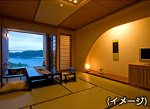 全室伊豆諸島を一望。海に面した露天風呂の開放感、溢れた眺めが心と身体を癒します。江戸城の石室にも使用された伊豆半島産の安山岩伊豆石を使用しております。沖合いに浮かぶ漁船の明かりが、露天気分を満喫させてくれます。