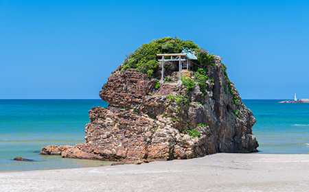 出雲大社の西方にある海岸で、国譲り神話や国引き神話ゆかりのパワースポットです。弁天島という小さな島があり、岩上には豊玉毘古命(とよたまひこのみこと)を祀る小さな祠があります。