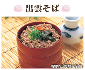 島根県の出雲地方で広く食べられる郷土料理の蕎麦です。割子そば・釜揚げそば等があり、日本三大そば(岩手県盛岡「わんこそば」、長野県「戸隠そば」、島根県「出雲そば」)の一つとされています。蕎麦粉を作るときソバの実を皮ごと石臼で挽くためそばの色は濃く黒く見え、香りが強いのが特徴です。