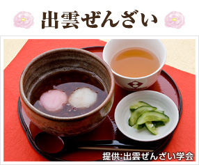 出雲地方では旧暦の10月に全国から神々が集まり、「神在祭(かみありさい)」と呼ばれる神事が執り行われていることは有名ですが、そのお祭りの折に振る舞われたのが「神在(じんざい)餅」。その「じんざい」が、出雲弁(ズーズー弁)で訛って「ずんざい」・・・、「ぜんざい」となって、京都に伝わったと言われています。