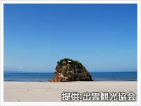 出雲大社の西にある海岸で、国譲り、国引きの神話で知られる浜です。浜辺の奥に大国主大神と武甕槌神(たけみかづちのかみ)が国譲りの交渉をしたという屏風岩があります。また、この浜は、旧暦10月の神在月に、全国の八百万の神々をお迎えする浜でもあります。