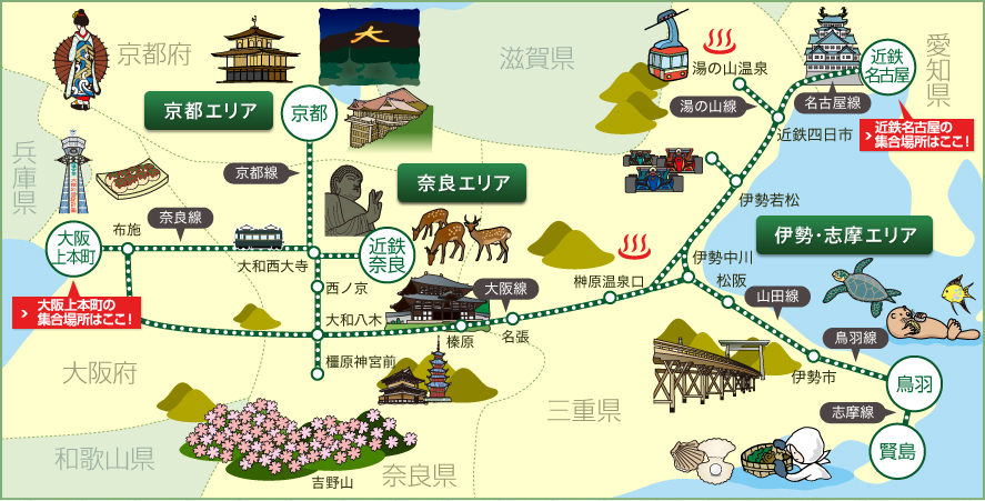 伊勢志摩・奈良・京都エリアへご案内 「かぎろひ」路線マップ