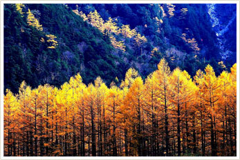 穂高連峰山頂に冠雪すると、「雪の白」「カラマツの黄金色」「針葉樹の緑」という、見事な三段紅葉を眺めることができます。