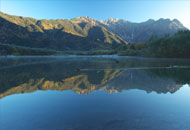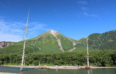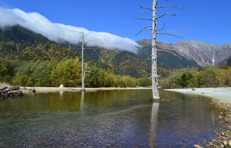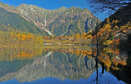 大正池は、大正4年の焼岳大爆発によってせきとめられてできた池。穂高連峰や焼岳、枯れ木が湖面に映る景観は、上高地を象徴する風景です。