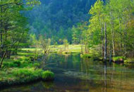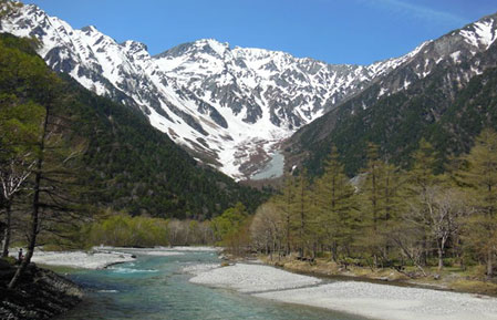 4月の半ばになるとウグイスが本格的な春の訪れを告げに戻ってきます。ウグイスに負けまいと美しいルリ色の羽を広げたオオルリがさえずりながら梢を渡り、芽吹きはじめた木立に色彩を添えます。5月~6月はニリンソウやエゾムラサキなどの高山植物もあちこちで咲き始めます。徳沢のニリンソウの群生は、ニリンソウがハルニレの木のあいだにまるで雪のように咲き誇り、生き物のあふれる生命力を感じられます。エゾムラサキは小さな花が集まって咲きますが、青や紫のほか、白やピンクがかかっていて、とてもカラフルです。