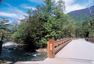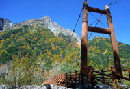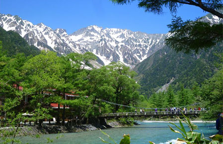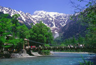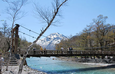 清冽な川にかかる河童橋は、上高地のシンボル。大正時代に造られた橋で、数回の架け替えを経て現在は五代目。大自然の中、果敢にかけられた吊り橋は、堂々たる山岳風景の中に溶け込んでいます。