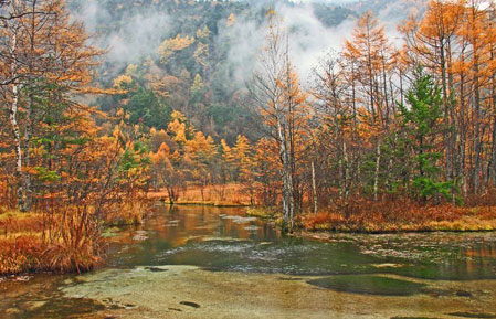 カラマツの葉が金色に色づいてくると、上高地は一面黄金色に輝きます。