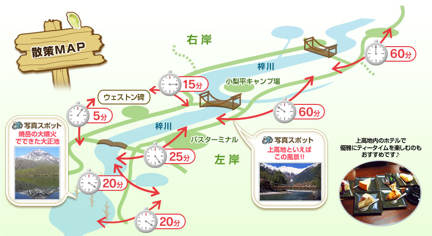 ● バスターミナル→河童橋→梓川右岸→ウエストン碑→田代橋→梓川左岸→バスターミナル