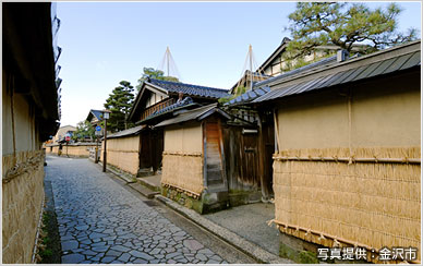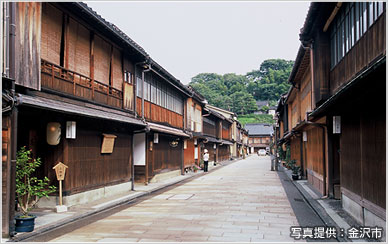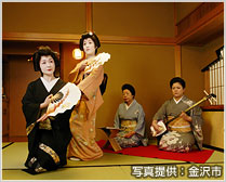 金沢には「ひがし」「にし」「主計町」の3つの茶屋街あり、それぞれが今も昔の面影を残しています。風情ある出格子の町並みとともに金沢芸妓の磨き抜かれた芸が継承されています。