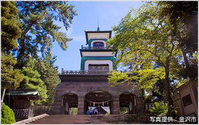 加賀藩初代藩主・前田利家公と正室お松の方を祀った尾山神社は、石段の頂上にそびえる三層楼門造りの神門がひときわ目を引きます。