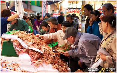 観光客のショッピングスポットにもなっており、新鮮な鮮魚をはじめ、青果、乾物、雑貨など200軒余りが並び、金沢市民、観光客を問わず賑わいをみせています。