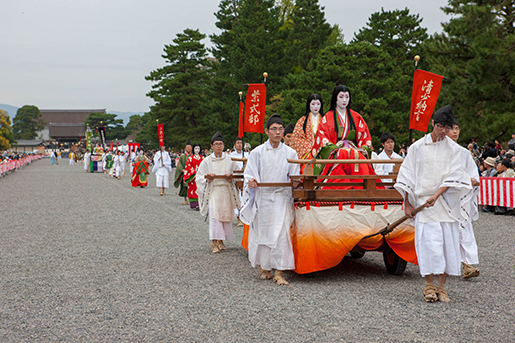 維新勤王隊の奏する笛、太鼓の音色を先頭に行列は順次、平安京の造営された延暦時代にさかのぼり、京都の秋を代表する祭となっています。