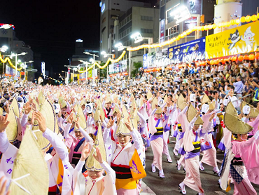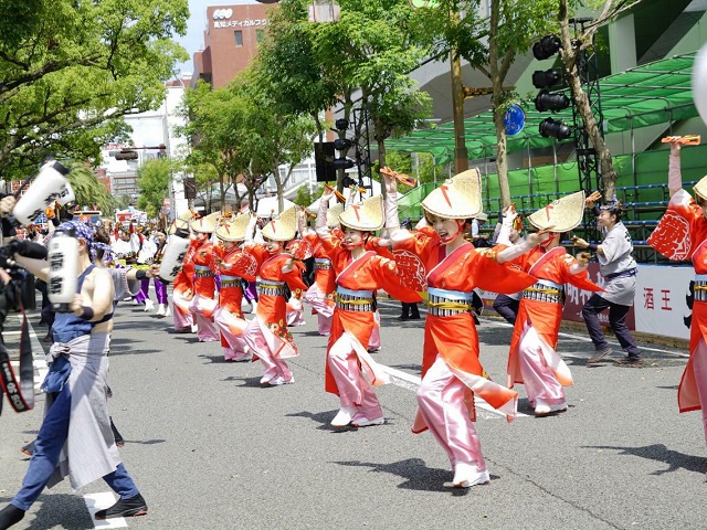 「花笠音頭」のリズムに乗り、踊り手たちが花の飾りがついた笠を持ちながら華やかに踊ります。賑やかで明るい雰囲気が特徴で、沿道の観客も参加しやすいお祭りです。
