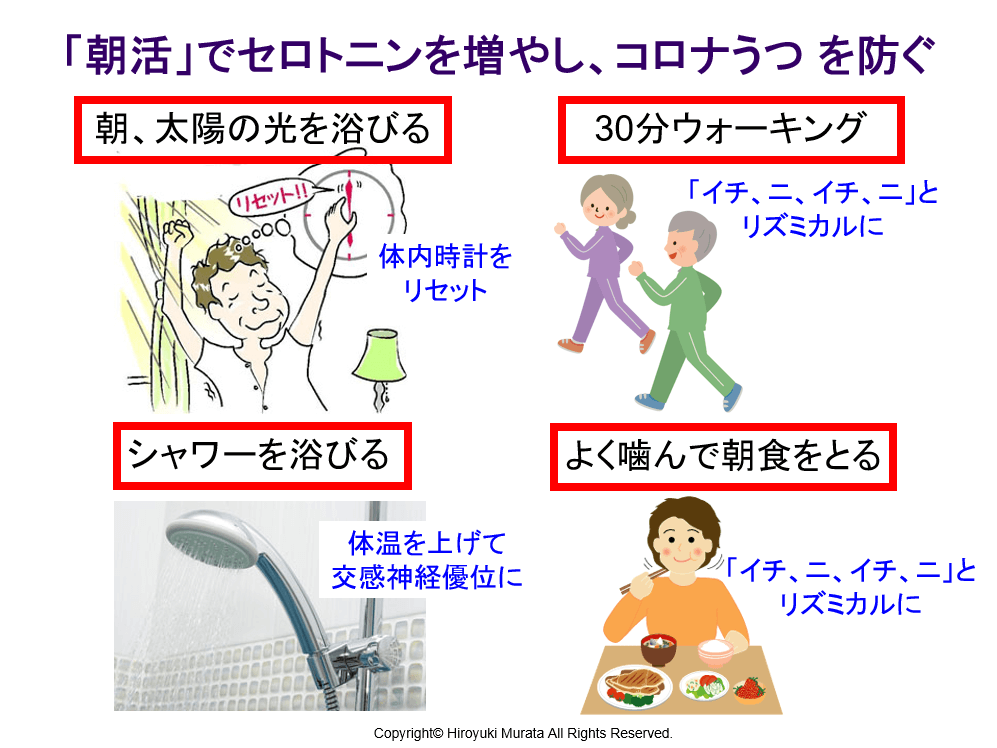 (1)朝活(第5回参照)をする。時間がなければ1日30分ウォーキングする。