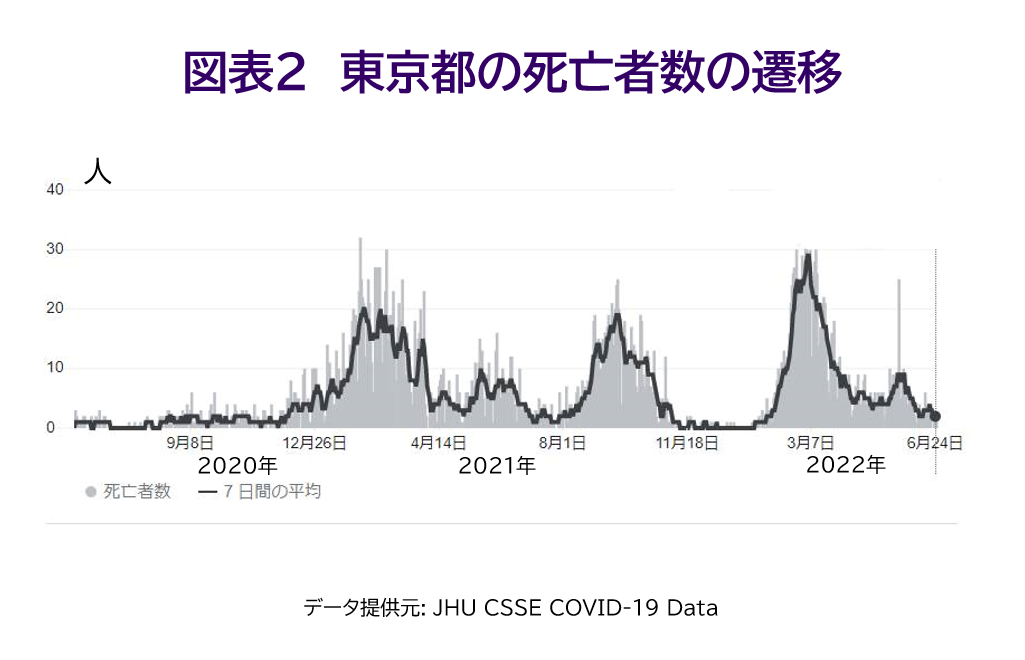 こうして一旦感染が縮小したように見えても、しばらくするとまた拡大し、周期的に繰り返されていきます。(図表1、2 東京都の新規感染者数と死亡者数の遷移)