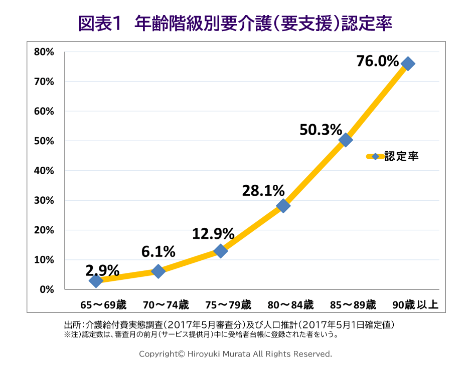 これより上述の年齢を過ぎると要介護状態になる方の割合が急増することが容易にお分かりいただけると思います。