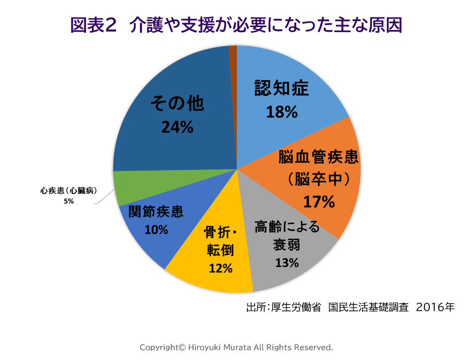 要介護状態になる原因の一番目が「認知症」です。二番目が「脳血管疾患」、つまり脳卒中です。認知症の原因疾患の約3割は脳卒中ですので、脳卒中が要介護状態になる原因の最上位といっていいでしょう。