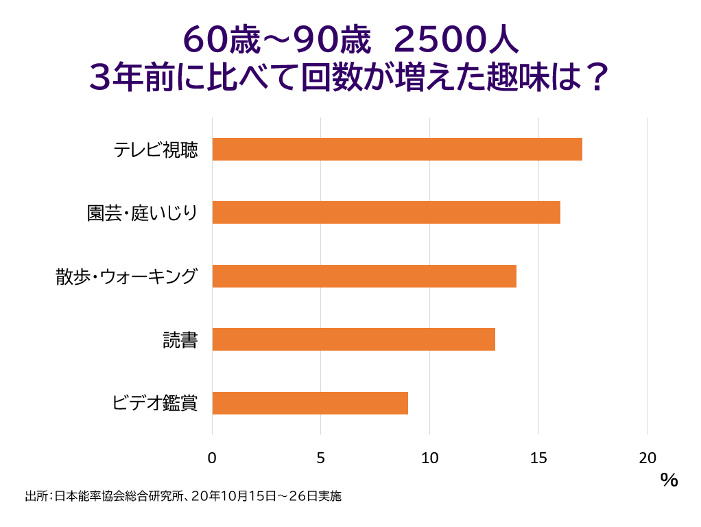 3年前に比べて回数が増えた趣味は何かという設問に対して、テレビ視聴17%、園芸・庭いじり16%、散歩・ウォーキング14%、読書13%、ビデオ鑑賞8%と回答があり、テレビ視聴とビデオ鑑賞頻度が増加していることがわかります。