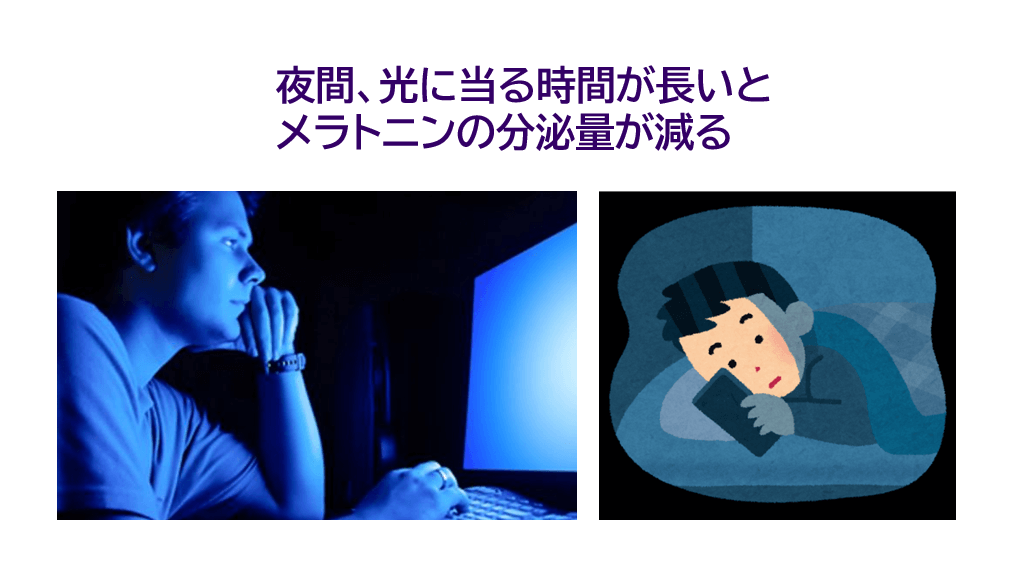 第三に、夜間、光に当たっている時間(光暴露時間)が長くなることで、メラトニンの分泌量が減ることです。