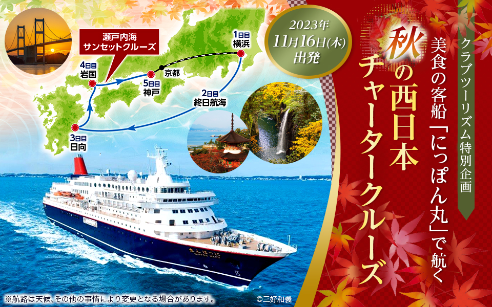 クラブツーリズムの「にっぽん丸 秋の西日本チャータークルーズツアー」!にっぽん丸で西日本の紅葉名所、日向、岩国、神戸へ。瀬戸内海サンセットクルーズでは、美しい島々の風景が夕日に染まる一味違った時間をお楽しみください。