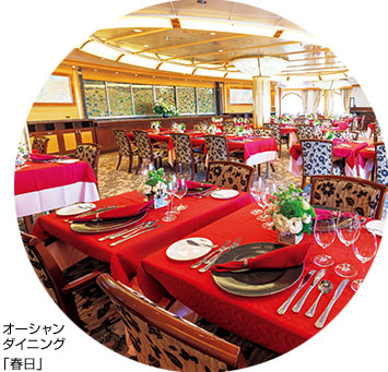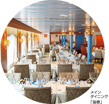 朝・昼・夕食で使用できるメインダイニング「瑞穂」。ダイニングルームの天井中央に12星座が描かれた照明などが華やかな雰囲気を演出し、バラエティ豊かなお食事と真心を込めた細やかなサービスをお約束します。