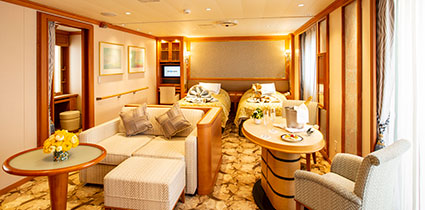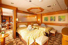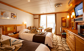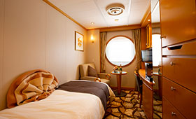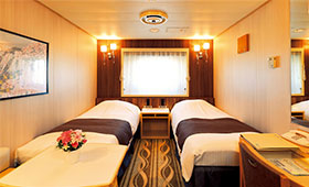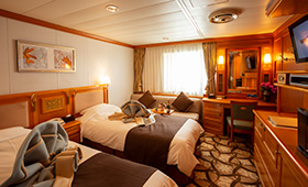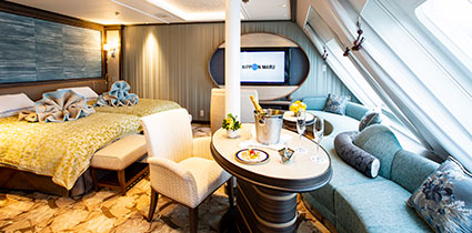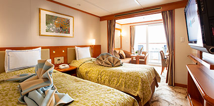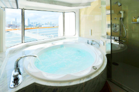 開放感あふれるバルコニー付き。ブローバス・トイレ付き。にっぽん丸バトラーがおもてなしします。