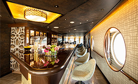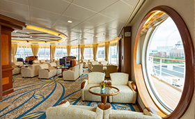 船首部分に位置し、180°大きな窓に囲まれた眺望が自慢のラウンジです。モーニングコーヒー&ティー、アフタヌーンティーの会場にもなります。併設されたデッキでは入出港シーンも楽しめます。