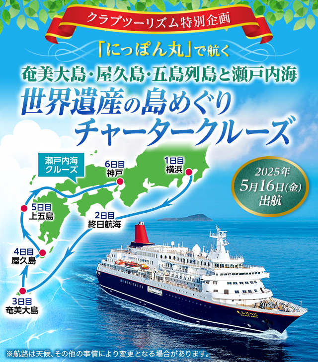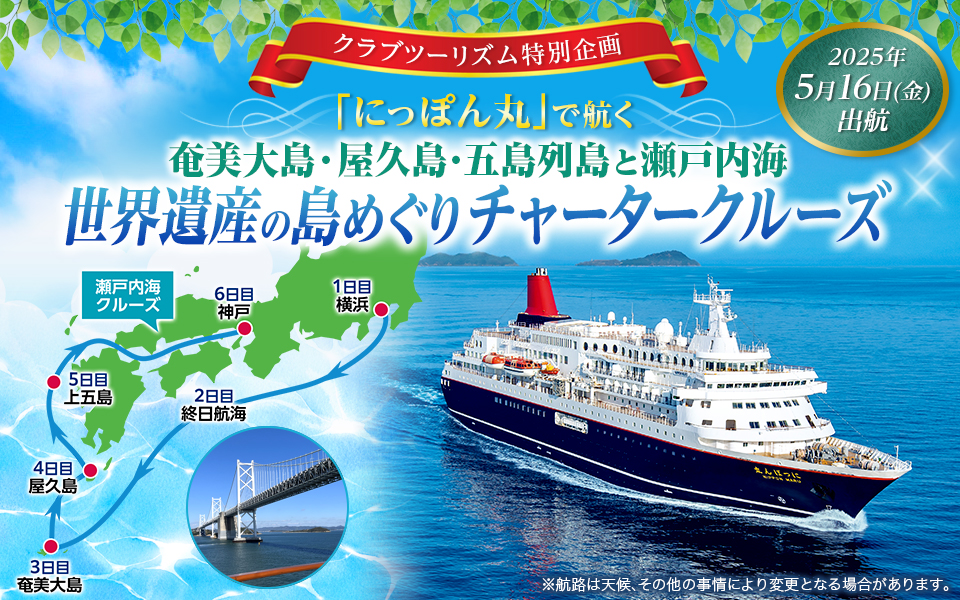 クラブツーリズムの「にっぽん丸 世界遺産の島めぐり 奄美大島・屋久島・五島列島と瀬戸内海チャータークルーズツアー」!にっぽん丸で世界遺産の3つの島を1度で巡る、クルーズならではの旅に出かけましょう!寄港地はもちろん、船内イベントも充実のクラブツーリズムチャータークルーズ。ツアーの検索・ご予約も簡単!