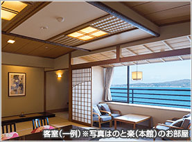 名湯七尾湾を望む露天風呂や石川県の海の幸、山の幸を使用したお食事をお楽しみいただけます。