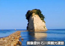 能登のシンボルとしてポスターなどでもよく見られる名所。島の形が軍艦に似ているところから別名「軍艦島」とも呼ばれる、高さ28mの奇岩です。