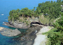 長い年月をかけて作りだした貫通洞門は、幅6メートル、高さ15メートル、奥行き60メートルにもなる石川県を代表する景勝地です。日本海の荒波によって浸食された迫力のある海岸線が朝鮮半島有数の景勝地「金剛山」に匹敵する見事な景観であることから「能登金剛」の名がつけられました。