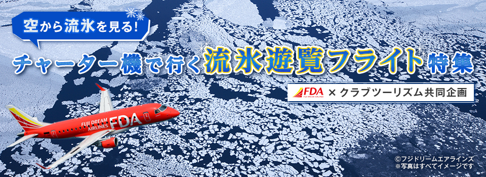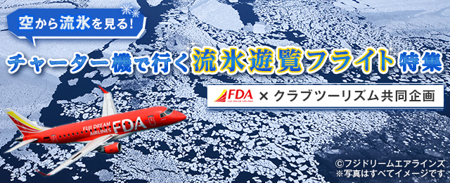 クラブツーリズムの空から流氷を見るオホーツク流氷遊覧フライト2026!チャーター便利用で往路降下の際にオホーツク海上空から流氷の景色を見物します。添乗員付きならしっかりサポート!ツアーの検索・お申し込みも簡単です。