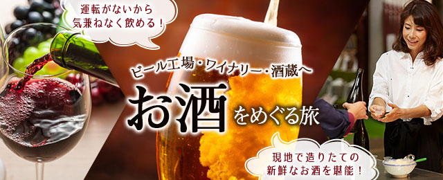お酒をめぐる旅・ツアーならクラブツーリズム!ビール工場・ワイナリー・酒蔵をめぐる旅へ。ツアーだから帰りの運転の心配なし!安心のトイレ付バスのツアーも!こころいっぱいお酒を楽しみましょう!