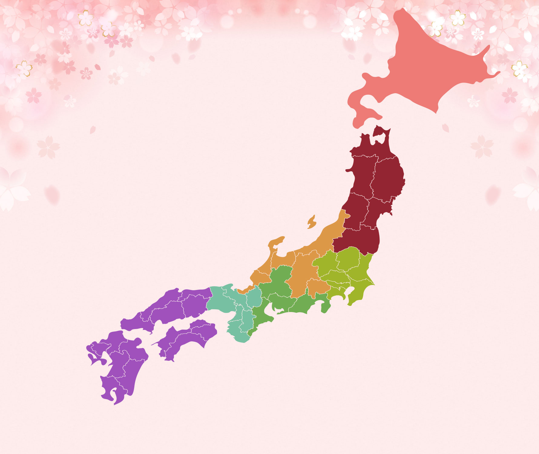開花時期は、温暖な気候の沖縄の1月下旬頃が最も早く、古都・京都や東海、関東、甲信越がおおむね3月下旬、東北が4月中旬、最も遅い北海道では4月下旬からとなります。開花時期は気象状況により前後する場合がございます。