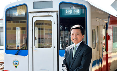 オリジナルの旗を持って三陸鉄道車両前にて(イメージ)