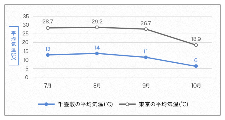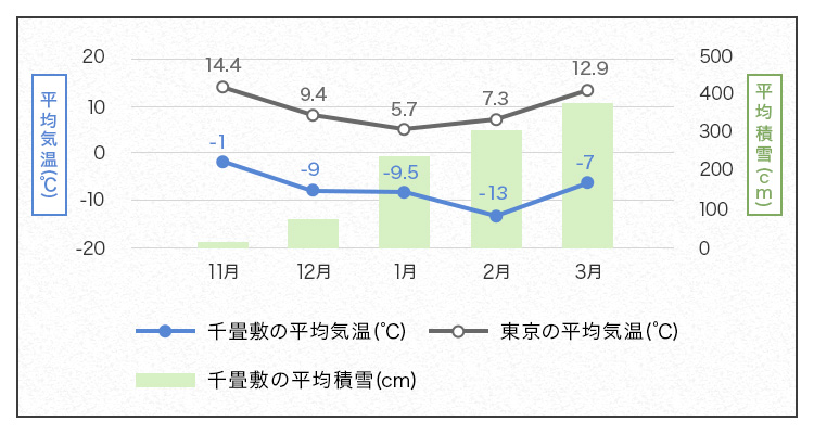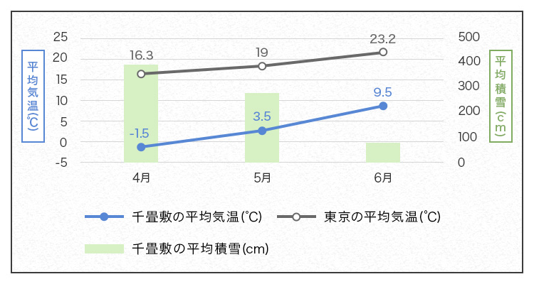 ※千畳敷の平均気温と積雪量は中央アルプス駒ヶ岳ロープウェイ、東京の平均気温は気象庁調べ(2023年)